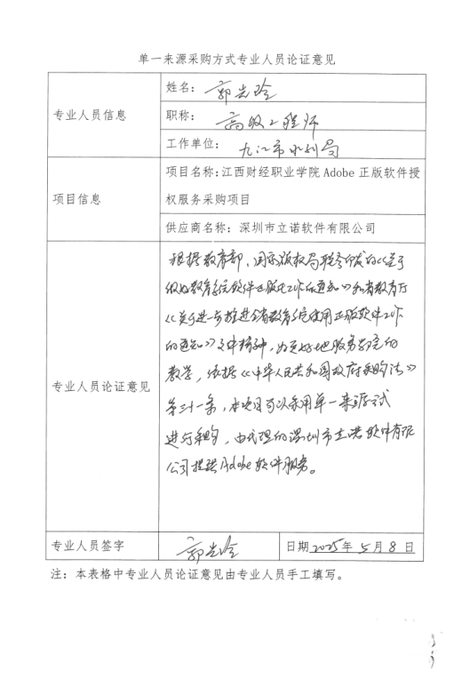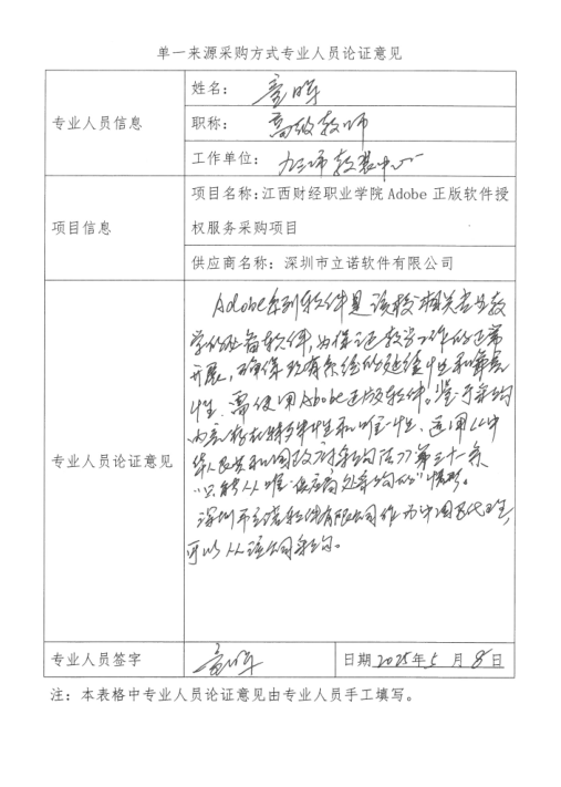附:单一来源采购方式专业人员论证意见表