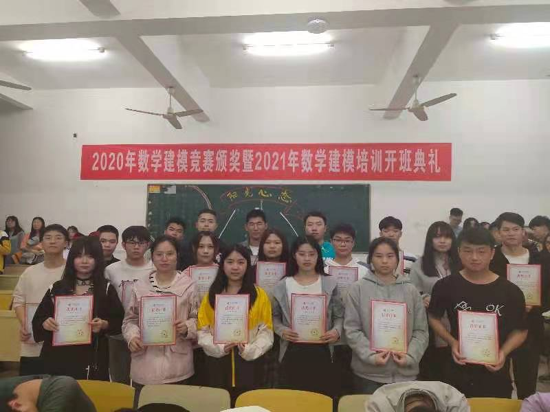 随后,主持人宣布为2020年全国大学生数学建模竞赛获奖学生颁奖。在一阵阵热烈的掌声中,2020获奖的七支建模队的同学纷纷上台领奖,与会领导和老师为获奖学生颁发了获奖证书。