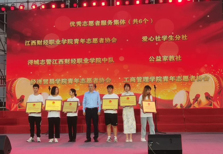 党委委员刘超为“五四红旗团支部”获奖代表颁发奖牌,工会主席、学工处、团委负责同志分别向“优秀志愿者服务集体”、“社团活动积极分子”、“2021年寒假社会实践先进个人”颁发奖章。