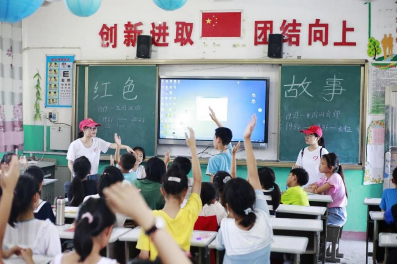 恰逢中国共产党建党100周年,为了让孩子们对党的历史有更加清晰的认识,支教队员们以此为契机,精心设计教学内容,将红色经典带上讲台。支教队专门开设了红色阅读课和党史知识教育课,用通俗易懂的语言给孩子们讲革命先烈的英雄故事、讲中国共产党一路走来的艰辛历程、讲五四精神、红船精神、井冈山精神和长征精神等革命精神。在“授”与“学”的良好氛围中,支教队员们与小朋友们共同学习、共同感悟,砥砺了爱国爱党之志,厚植爱国爱党之情。