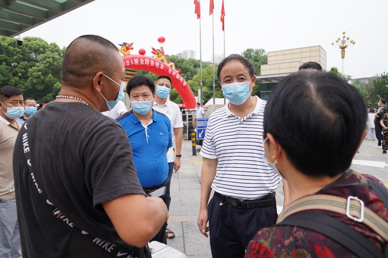 随后,校领导一行又来到校门口实地查看了新生报到情况和疫情防控工作,并与2021级新生及新生家长亲切交谈。“同学是从哪里来的?”“最近天气较热,要注意身体。”、“还有什么困难?”亲切的问候让新生们感受到了家的温暖。