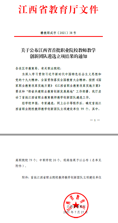 暑期,江西省教育厅发布《关于公布江西省首批职业院校教师教学创新团队遴选立项结果的通知》,beat365智能建造技术等6个专业教师教学创新团队成功入选。具体如下。