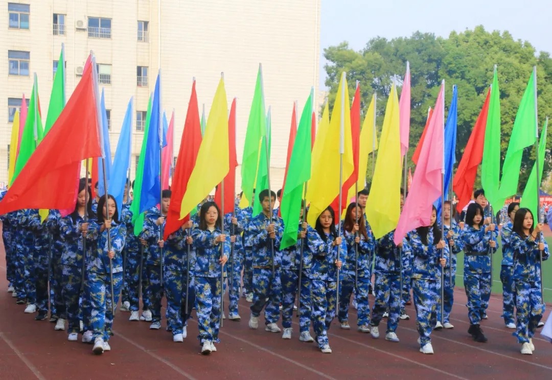 在高昂的运动员进行曲中,国旗队、彩旗队踏着铿锵的鼓点,意气风发,迈着整齐的步伐,走向主席台。