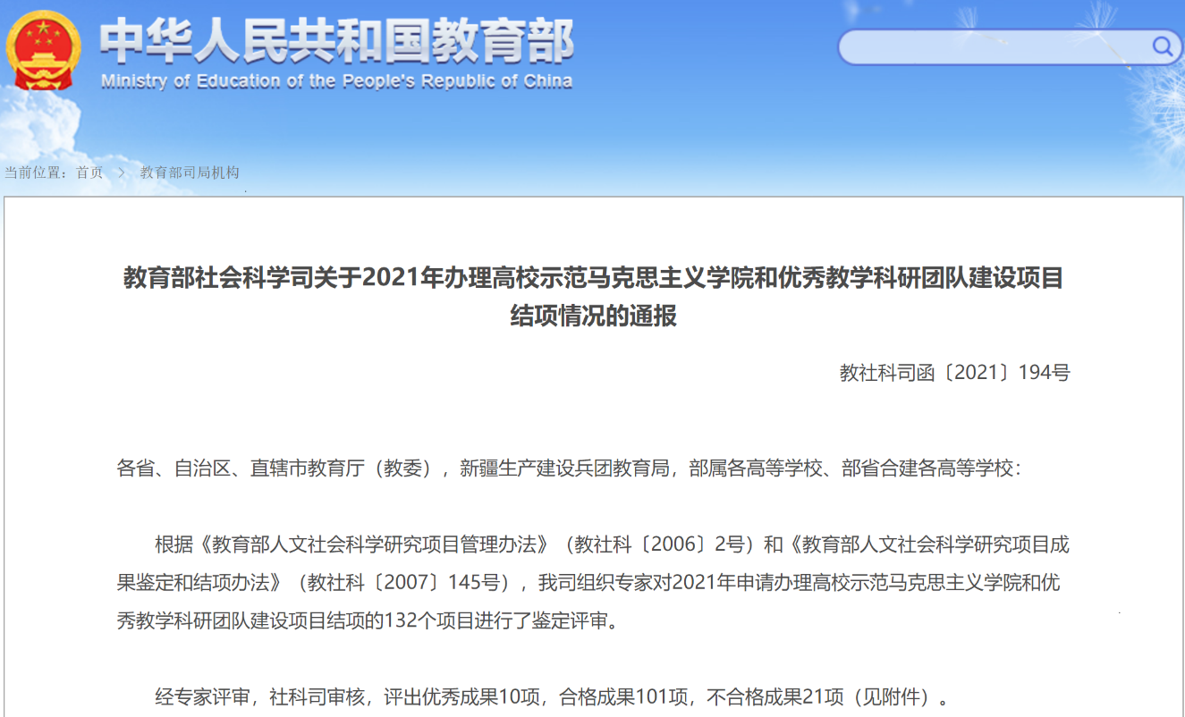 12月8日,教育部社会科学司公布了2021年办理高校示范马克思主义学院和优秀教学科研团队建设项目结项情况,beat365马克思主义学院副院长熊晓兰主持的《大数据背景下高职思想政治理论课移动平台构建》(项目批准号:17JDSZK072)获评为优秀成果。此次共有全国本专科院校132个项目结项,有10个项目被教育部评为优秀,本项目是江西省唯一获评优秀的项目。