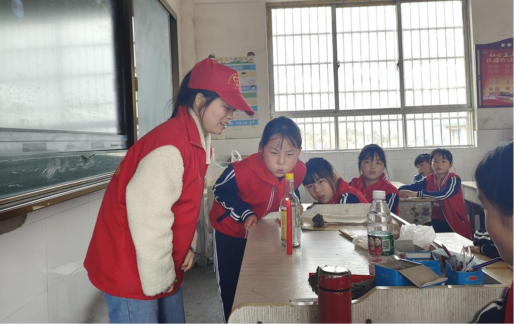 科普实验课上,志愿者刘艳婷通过“隔空吹蜡烛”的实验,为孩子们讲解了相关的科普知识。生动又新颖的活动形式引得孩子们踊跃参与,争先恐后地上台亲身体验。有趣的实验激起了孩子们的好奇心,悄悄地在孩子们心中播下了“学科学、爱科学”的种子。