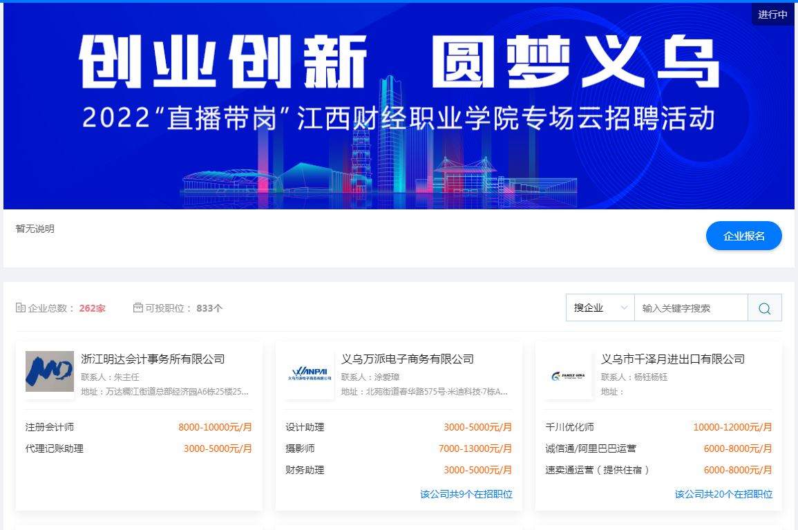 本次网络招聘会共有262家义乌企业参加,提供会计、外贸、电商、销售等岗位833个,所有参会企业均由义乌市人社局根据学校专业特色筛选而来,企业发展前景优良,岗位待遇优厚。本次招聘会采用网络直播的形式进行,通过“岗位介绍+线上答疑+直播投递”实时互动方式,精准对接用人单位与求职人员的需求,直播观看学生人数达到3000多人,收到简历300余份。
