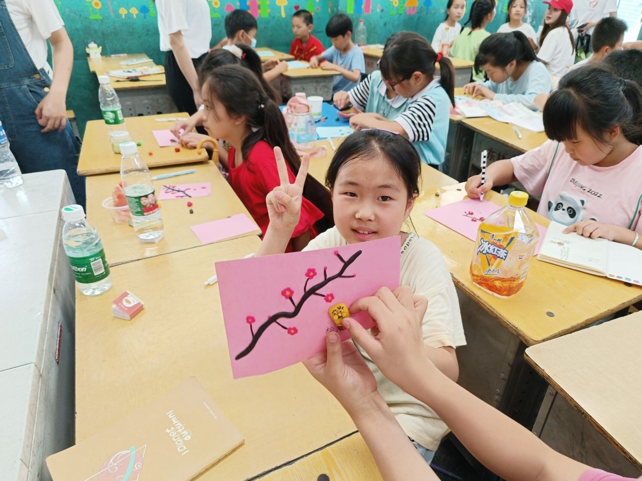 红色的、蓝色的、黄色的、粉色的卡纸,在小朋友们的手中,变成了一艘航母,变成了一支狐狸书签,变成了一顶小军帽,变成了各种各样的小动物、花草树木。在鲁溪镇梅颜村小学,小朋友们跟随志愿者小胡老师的步伐,折出了实用又美观的狐狸书签;在鲁溪镇中心小学,小朋友们在志愿者小李老师的带领下,用橡皮泥制作出各自的作品,极具创意!