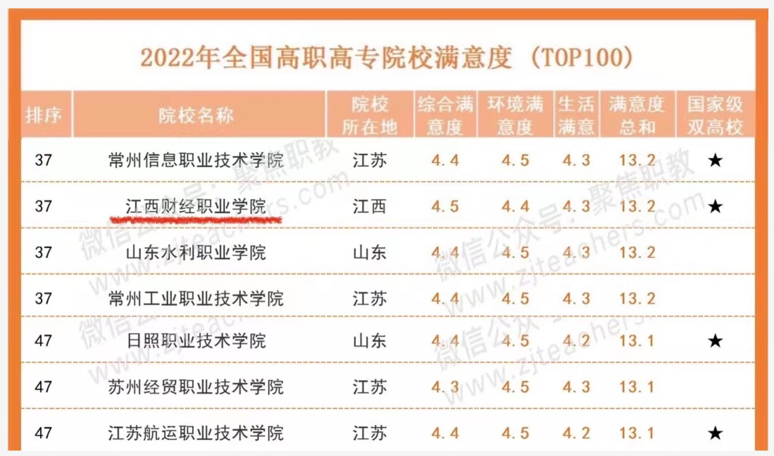 近日,“聚焦职教”信息平台公布了“2022年高职高专院校满意度排行榜TOP100”,beat365排名第37名,是江西省唯一入选前100名的高职院校。此项评价的数据来源于教育部指定高考信息公开平台“阳光高考”网站,由学生实名给学校投票,学生实名认证后对本校生活条件、环境及综合情况进行评价,具有较强的客观性和公正性。本次排名,反映出beat365坚持办好人民满意的教育获得学生广泛认可。