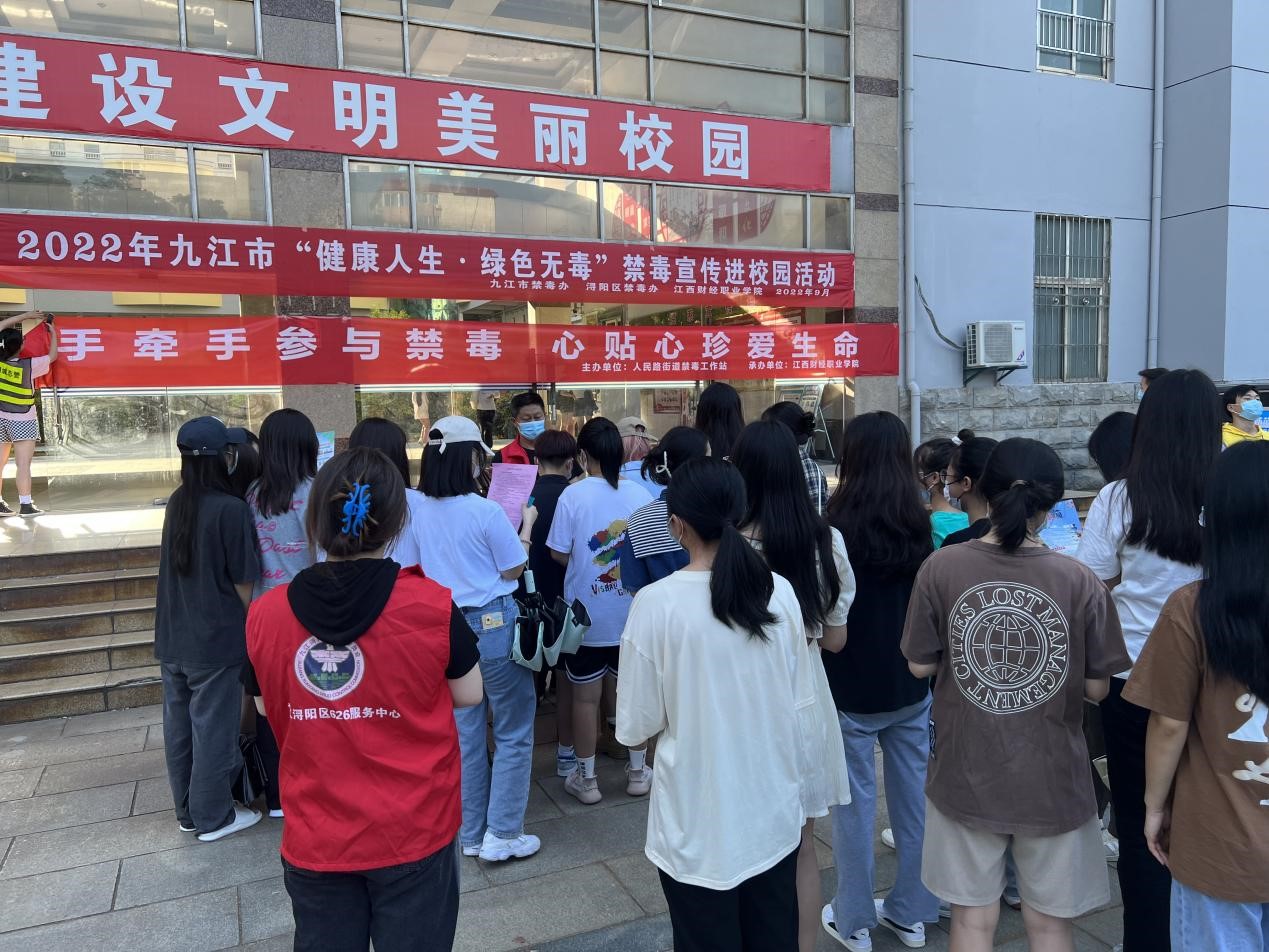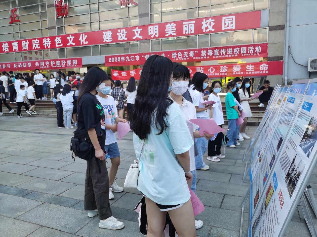 九江市公安局民警和人民路社区工作人员现场通过发放宣传资料、解读宣传展板的方式,详细讲解了毒品的常见种类和预防常识,并以未成年人毒品预防、防范新型毒品和毒品滥用为重点,普及禁毒法律法规,使广大师生充分了解毒品对个人、家庭、社会、国家的危害,告诫大家要珍爱生命,远离毒品。