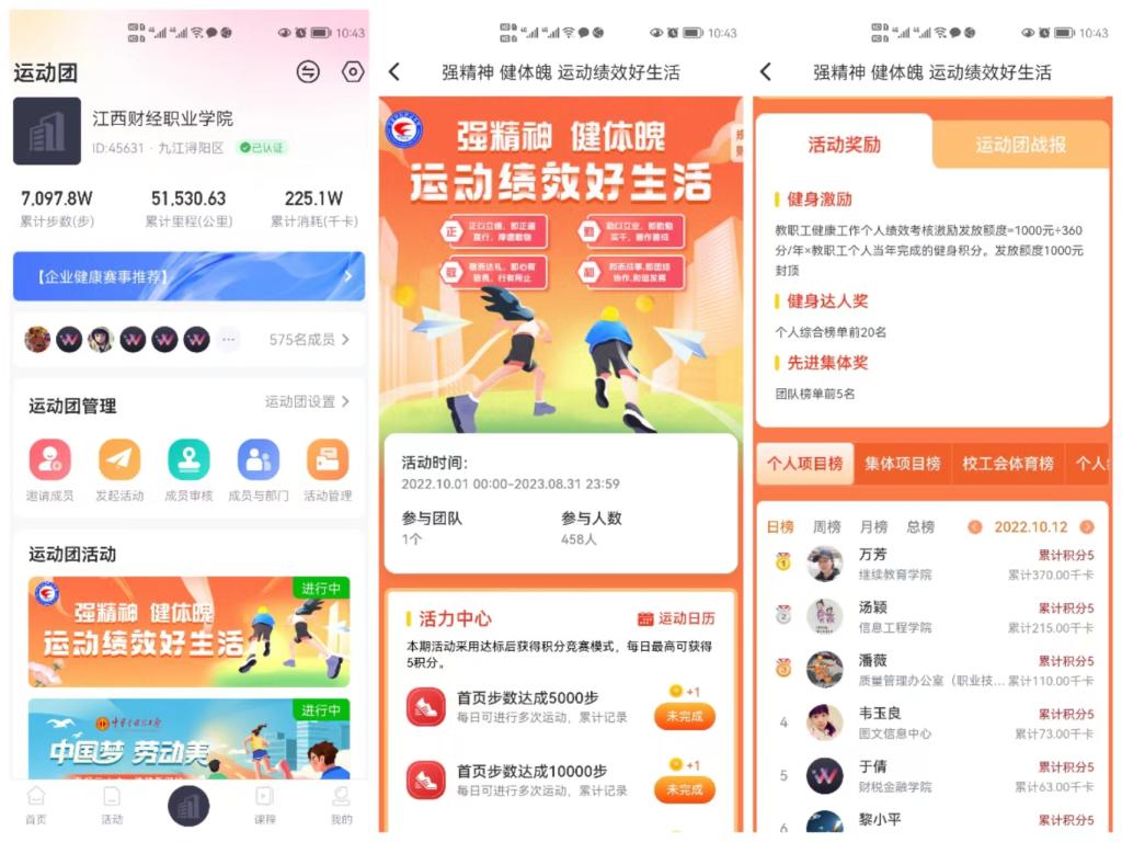 当健康“遇见”绩效,我们这样做。2022年5月,学校出台《beat365平台唯一官网教职工健康建设工作方案》(试行),与北京趣动科技有限公司合作开发出beat365“趣动will go”APP专用运动平台模块,并于国庆节期间正式投入使用。目前在平台中参与的人数达575人。活动分线上、线下两种积分方式,线上任务菜单由健步、跑步、骑行、多项AI健身四大主题功能板块组成,共20个运动打卡项目;线下则根据各个兴趣班和各类体育比赛的参与情况等进行积分,最终积分纳入个人绩效考核奖励及部门绩效考核。