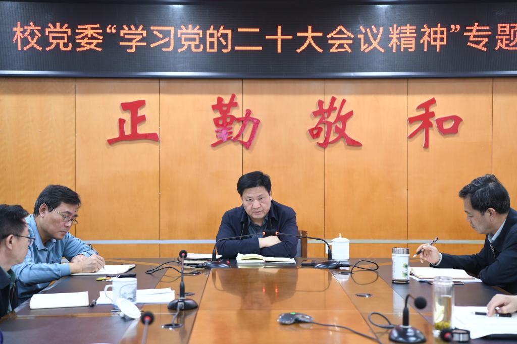 就如何贯彻落实党的二十大精神,刘彪文强调,一要提高政治站位。全校领导干部要以身作则,先学一步、深学一层,要下到基层一线,到师生中去做好宣传教育工作,在学习贯彻中做好表率作用。二要精心组织学习。学校党委和各党总支要结合学校实际,开展内容丰富、形式多样的宣传教育活动,办好党的二十大精神学习成果展,全面展示学校上下学习贯彻党的二十大精神的良好精神风貌。三要坚持学以致用。要以学习贯彻党的二十大精神为动力,在深化改革、攻坚克难中推动学校各项工作实现新跨越、开创新局面,以实际行动学习好贯彻好落实好党的二十大精神。