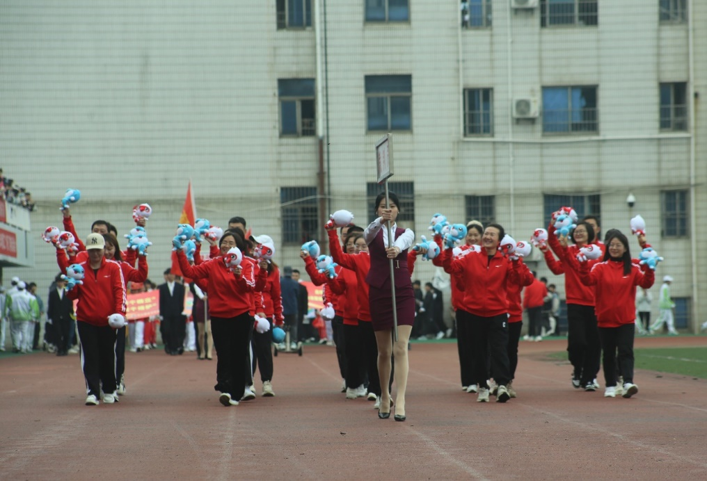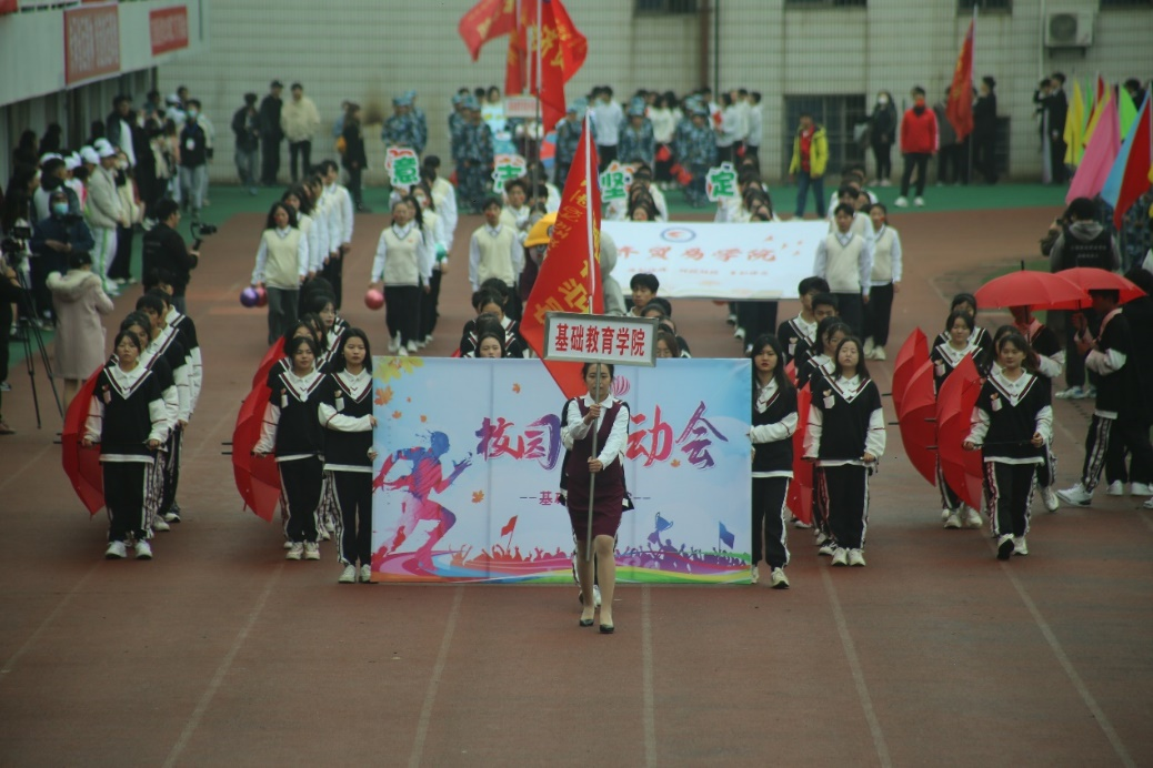 在全场欢呼声中,伴着激昂的进行曲,国旗班同学高擎中华人民共和国国旗,迈着正步、雄姿英发地通过主席台。在鲜艳的五星红旗引领下,校旗队、彩旗队、裁判员代表队、各二级学院(部)代表队、教职工代表队意气风发步入运动场,向观众们挥手致意。