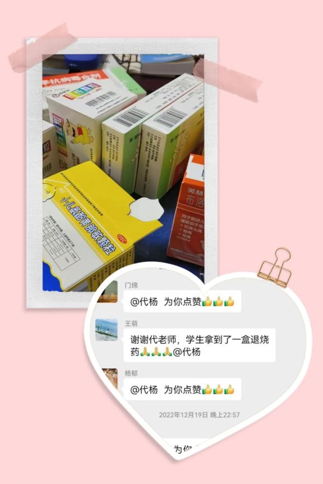 “我可以匀出3粒布洛芬给学生,装在袋子里写好名字放门卫了,学生可以来拿”“我正发着烧不能出门,我老公现在把药送去学校了”“学生已经拿到药了”。在工会主席门绵的号召下,大家纷纷在微信群里接龙,将自家的药品匀出来送到学校给需要的学生们,即使是在深夜,即使自己身体不舒服,也要为留在学校的孩子们“雪中送炭”,解燃眉之急。此外,老师们还通过微信群相互鼓励,分享抗疫经验,传递爱心温暖。群内每天的各种互动交流,涌动着浓浓的关爱,也留下了许多赠药送药、互帮互助的佳话。