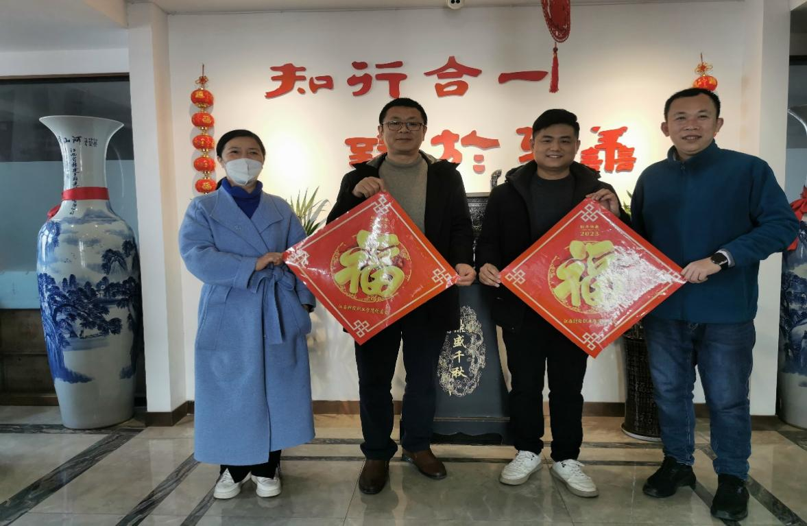 次日,刘锋一行来到86级优秀校友王文静的江西茂贤项目管理咨询有限公司,双方就落实加强合作交流,开展订单式人才培养模式,深化实习就业合作培养高素质人才、教师顶岗培训等方面达成合作意向。刘锋为校友企业送上春联,表达了母校对校友企业的新春问候,祝愿企业发展越来越好,也希望在新的一年里校企合作更上一层楼。