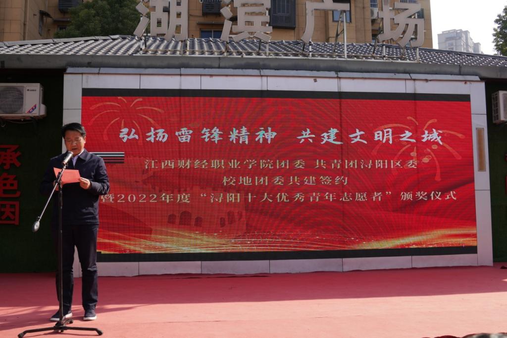 为贯彻落实习近平总书记对深入开展学雷锋活动作出的重要指示精神,校团委与共青团浔阳区委于3月6日在湖滨社区广场举行了校地团委结对共建签约暨2022年度“浔阳十大优秀青年志愿者”颁奖仪式。校党委副书记、校长彭慧出席并致辞,浔阳区委副书记查忠平、校党委委员刘锋等领导出席了此次活动。