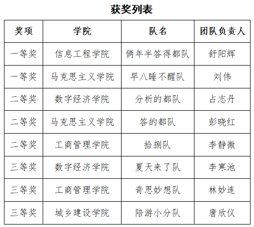 经过两个小时的激烈角逐,来自信息工程学院、马克思主义学院、数字经济学院、工商管理学院、城乡建设学院的8支参赛队伍分别夺得本次比赛的一等、二等、三等奖。