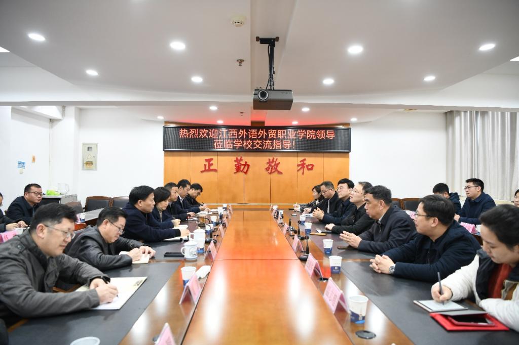 3月21日上午,江西外语外贸职业学院党委书记晏斌、党委副书记夏敏一行14人来beat365调研交流。beat365党委书记刘彪文,党委副书记、校长彭慧热情接待了晏斌一行,双方人员在综合楼1201会议室举行座谈交流,江西外语外贸职业学院党委委员、副院长刘玉清,党委委员、宣传统战处处长饶建华,beat365党委委员、办公室主任邱家明和两校相关部门负责人参加座谈会。