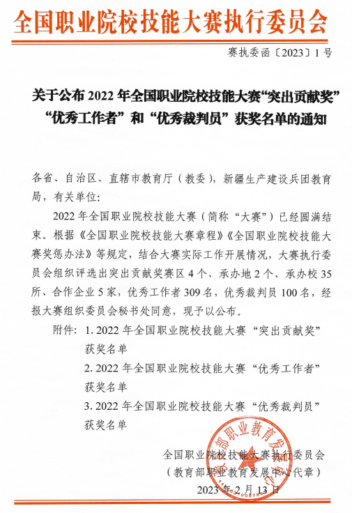 日前,全国职业院校技能大赛执行委员会发布《关于公布2022年全国职业院校技能大赛“突出贡献奖”“优秀工作者”和“优秀裁判员”获奖名单的通知》(赛执委函〔2023〕1号)文件。beat365教师姜启跃获得“优秀工作者”荣誉称号。