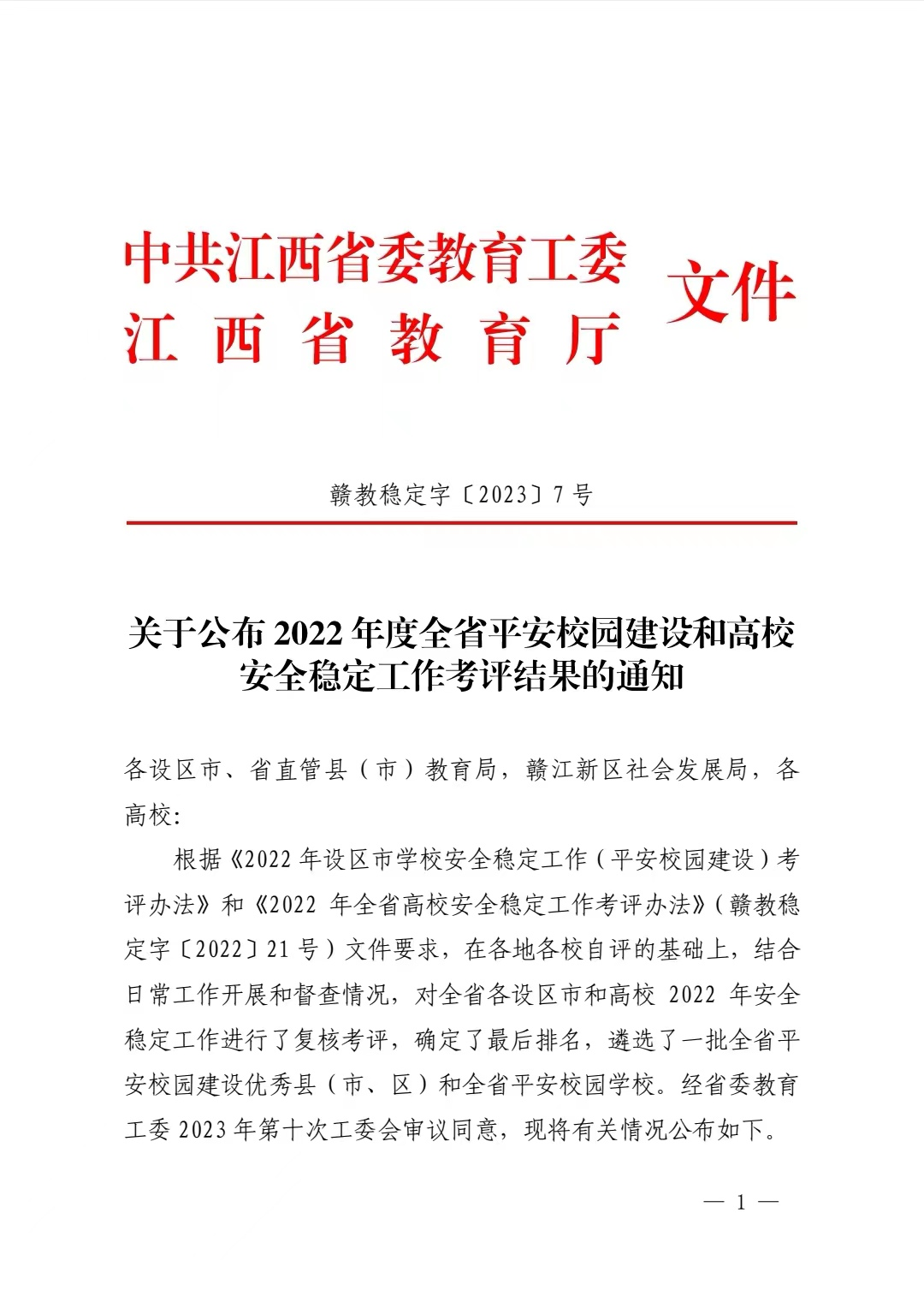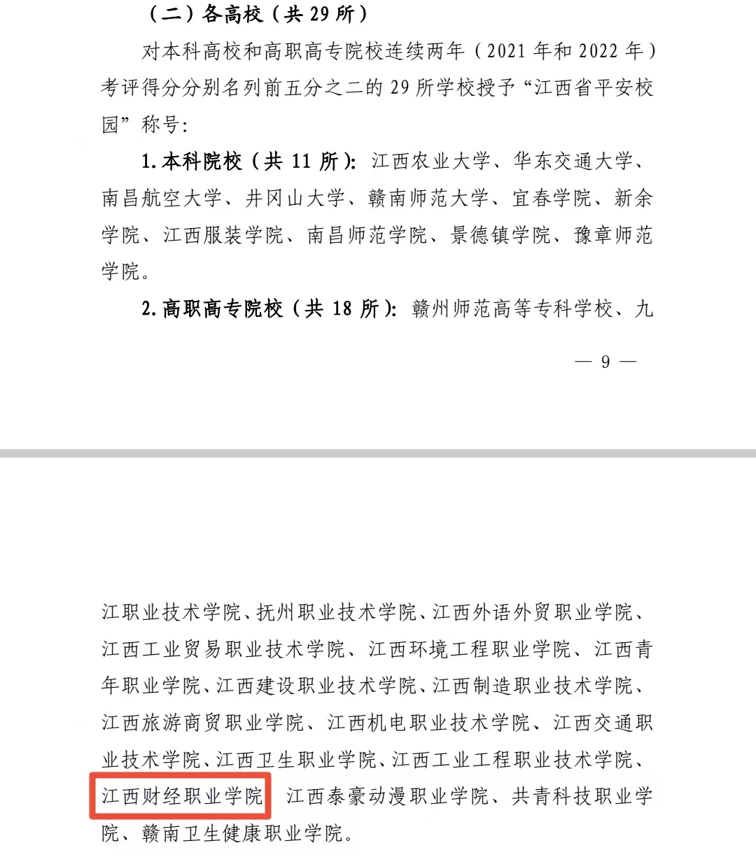 近日,中共江西省委教育工委、江西省教育厅印发了《关于公布2022年度全省平安校园建设和高校安全稳定工作考评结果的通知》,beat365在全省高校安全稳定工作考评中连续两年获得优秀,被授予“江西省平安校园”称号。