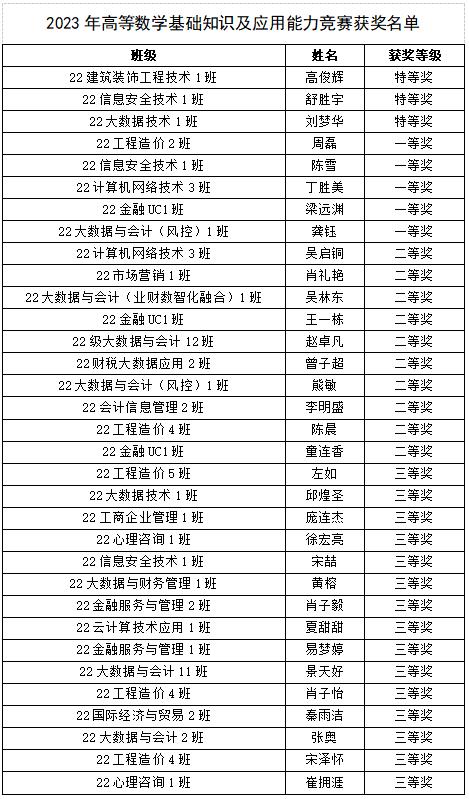 基础教育学院高度重视本次竞赛,多次组织老师们讨论活动方案、出题难度、监考安排、阅卷分工等事项,保证比赛全过程公平公正、真实客观。数学教研室老师们同心协力、尽职尽责,精心准备试题、认真监督考试、及时批阅试卷。随着评卷结束,获奖名单也随之而出,三十三名同学荣获以下奖项: