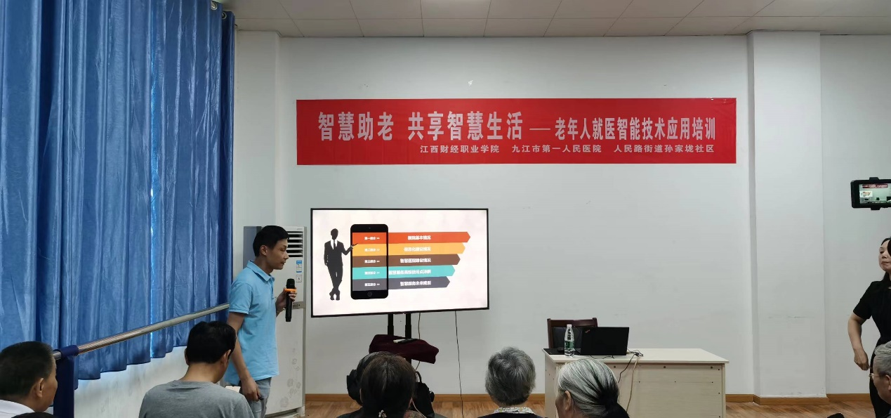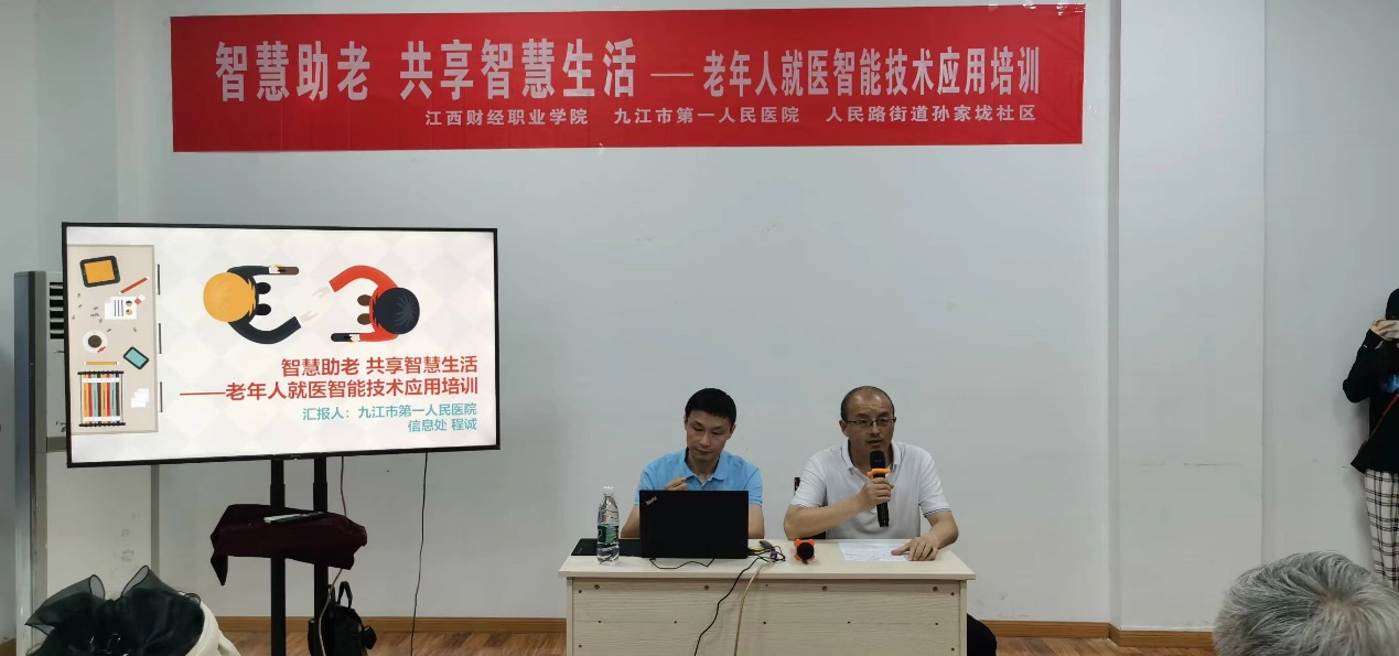 下午3:00培训开始,授课讲师——九江市第一人民医院信息处处长程诚以“智慧助老 共享智慧生活—老年人就医智能技术应用”为主题,就智慧医院的建设情况进行了介绍,并着重讲解了电子医保激活、建档管理、线上预约挂号、诊间支付、自助设备的使用、电子票据、结果查询等高频使用的就医智能技术运用知识。通过深入浅出地讲解,使参加培训的学校离退休教职工和社区老年人受益良多,他们纷纷表示“这个培训非常及时必要,老年人有很多不懂的就医智能操作可以在这里学到,对我们更好地融入智慧社会提供了极大地帮助”。
