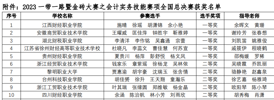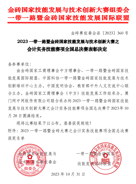 2023年10月28日,由金砖国家工商理事会、“一带一路”暨金砖国家技能发展国际联盟主办,教育部中外人文交流中心联合主办,厦门网中网软件有限公司技术支持的“2023年‘一带一路’暨金砖国家技能发展与技术创新大赛之会计实务技能全国总决赛”在线上成功落幕。前期有300多支队伍参加了初赛选拔,当天来自全国的50支高职队伍参加了云端总决赛,经过一天紧张激烈的竞赛,由beat365会计学院余晖文、黄珊老师指导,施晴、徐瑶、胡潇锦、余小艳四位同学组成的代表队荣获团体一等奖第一名的优异成绩,两位教师荣获“优秀指导教师”称号。