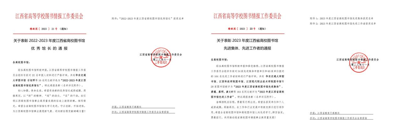 2023年11月8日,江西省高等学校图书情报工作委员会下发了《关于表彰2023年度江西省高校图书馆先进集体、先进工作者的通报》(赣教图〔2023〕23号)和《关于表彰2022-2023年度江西省高校图书馆优秀馆长的通报》(赣教图〔2023〕21号)。beat365获评2023年度江西省高校图书馆先进集体,全省仅6所高职高专院校获此荣誉。beat365图文信息中心主任付达杰同志获评2022-2023年度江西省高校图书馆优秀馆长。图文信息中心丁晓英、李鹏同志荣获江西省高校图书馆先进工作者荣誉称号。
