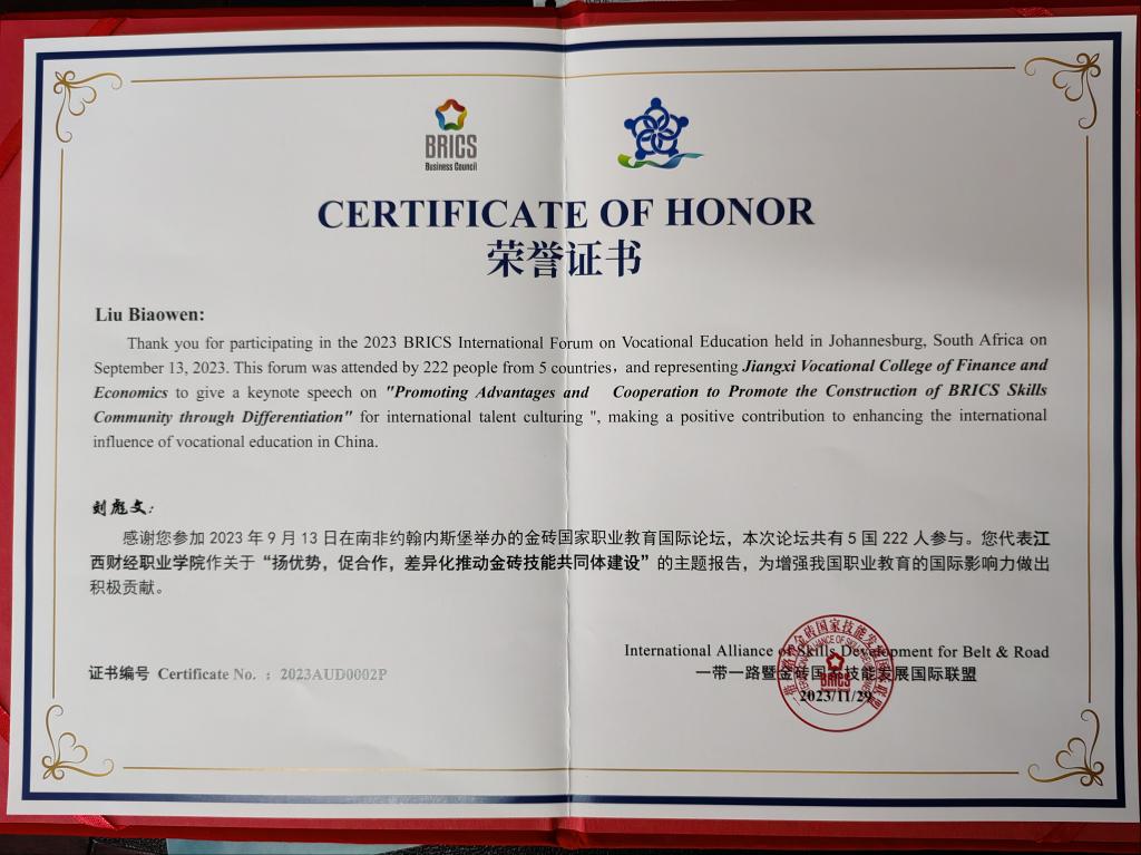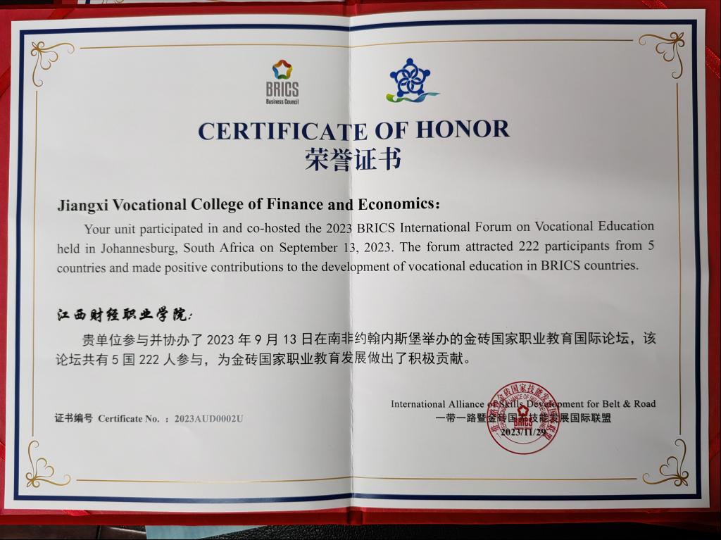 会上,四川财经职业学院党委书记张华为大会致辞,她首先对与会嘉宾的到来表示热烈欢迎。她表示,国际化既是高校迈向世界、走向卓越的必由之路,也是提升高等教育发展质量的重要途径,希望本次会议能为数智财经高等教育搭建良好平台,为财会专业的国际化发展贡献更多的力量。会议听取了“以中国标准引领金砖+教育”“‘机器学习与大数据’金砖国家国际团体标准建设经验分享”等报告、委员会2023年工作成果及2024年主要工作安排。会议还汇报了2023年金砖国家(南非)职业教育论坛开展情况,并对为金砖国家职业教育发展事业作出重大贡献的单位和个人进行表彰,beat365和校党委书记刘彪文获此殊荣。