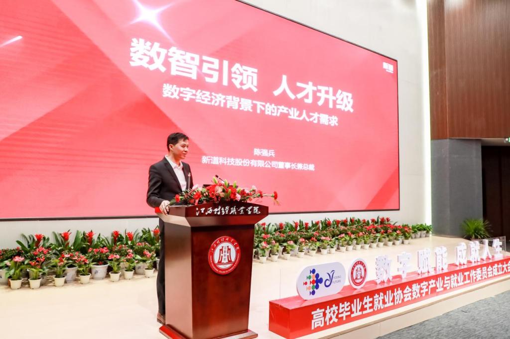 新道科技股份有限公司董事长兼总裁陈强兵聚焦数字经济是中国经济高质量发展的关键引擎、数字人才是中国数字经济发展的核心驱动力两方面内容,发表了题为“数智引领 人才升级—数字经济背景下的产业人才需求”演讲。