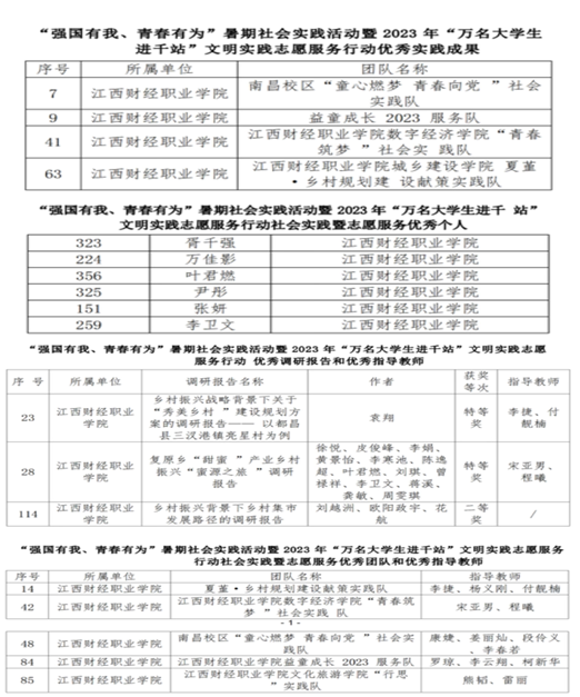 近日,由省委宣传部、省文明办、省教育厅、团省委联合开展的“强国有我、青春有为”暑期社会实践活动暨2023年“万名大学生进千站”文明实践志愿服务行动评审结果揭晓,beat365平台唯一官网喜获多项表彰。