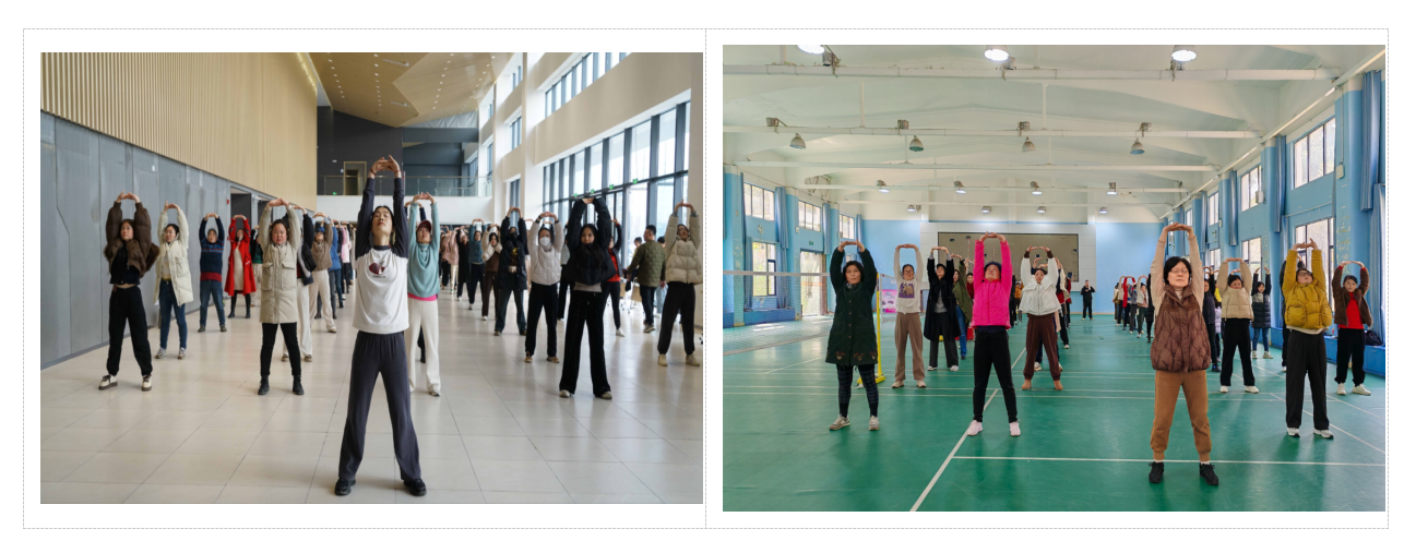 本次活动在beat365八里湖校区和浔阳校区同步展开,活动包含集体八段锦展示与线下打卡两个环节。在第一个“八段锦展示”环节中,beat365女教职工们充分展现了令人钦佩的活力与坚韧。她们以健康与自信的笑容,配合着音乐的律动,流畅地完成了每一个动作。