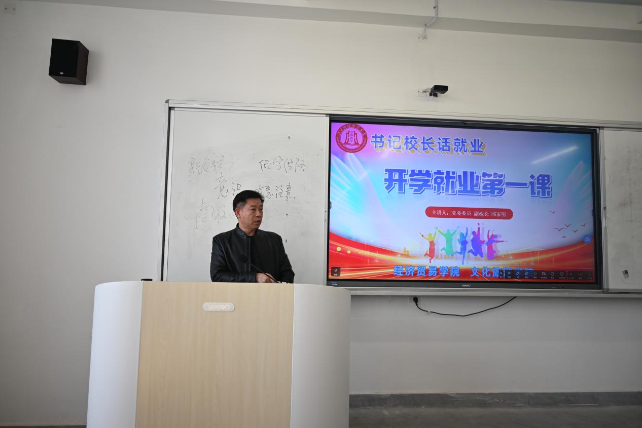 为加强就业指导,帮助大学生深入了解国情社情,科学规划职业生涯,3月12日下午校党委委员、副校长邱家明来到文化旅游学院、经济贸易学院讲授开学就业第一课。
