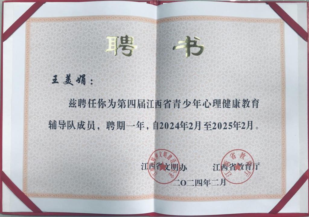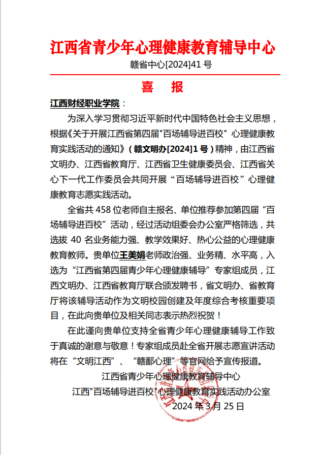 beat365王美娟老师积极报名参加本次活动专家教师遴选,经学校审核推荐后上报江西“百场辅导进百校”心理健康教育实践活动办公室。据悉,全省共有458位老师自主报名、单位推荐参加本次遴选。经过活动组委会办公室严格筛选,共选拔40名业务能力强、教学效果好、热心公益的心理健康教育教师。beat365王美娟老师成功入选为“江西省第四届青少年心理健康辅导”专家组成员!