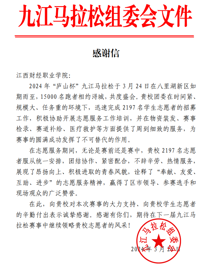 3月24日,由江西省体育局、九江市人民政府主办的2024“庐山杯”九江马拉松在八里湖鸣枪开跑。beat3652197名学生承担了赛事志愿服务工作,为此次参赛人数达15000人的体育盛会提供了全面而周到的志愿服务。