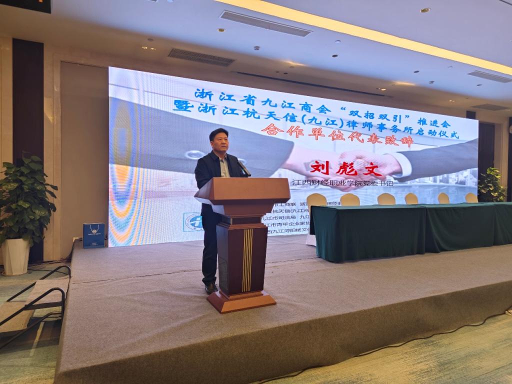 刘彪文在致辞中首先对九江商会“双招双引”推进会和浙江杭天信(九江)律师事务所启动仪式的成功举办表示热烈祝贺。他指出,市场经济就是法治经济,经济越发达,对于法律的呼唤越强烈。他引经据典,谈了对法律的认识:“何为法?法如水度公平,法如镜辨是非,法如绳量曲直”“何为律,律是规则、标准,律是节奏、尺度,律是号令、约束”“何为师?师者,授人以知以识,教人以道以德,树人以本以魂”。刘彪文表示,法律工作者,同时也是教育者。紧盯国家战略,服务地方经济社会发展,培养优秀的基层法律工作者,是学校的使命、职责和担当。要实现中国式现代化,首要的要求是经济现代化,重要保障是法律现代化,“奉法者强则国强,奉法者弱则国弱”“令在必信,法在必行”“有法而无志其义,则渠渠然;依乎法而又深其类,然后温温然”。最后,他强调,围绕国家第二个百年奋斗目标,实现九江打造“三个区域中心”建设“一个美好家园”的宏伟蓝图,推进九江经济现代化,是九江法律界、商界和教育界共同的使命和职责。beat365与杭天信(九江)律师事务所的深度融合,将为九江的再度辉煌贡献力量。