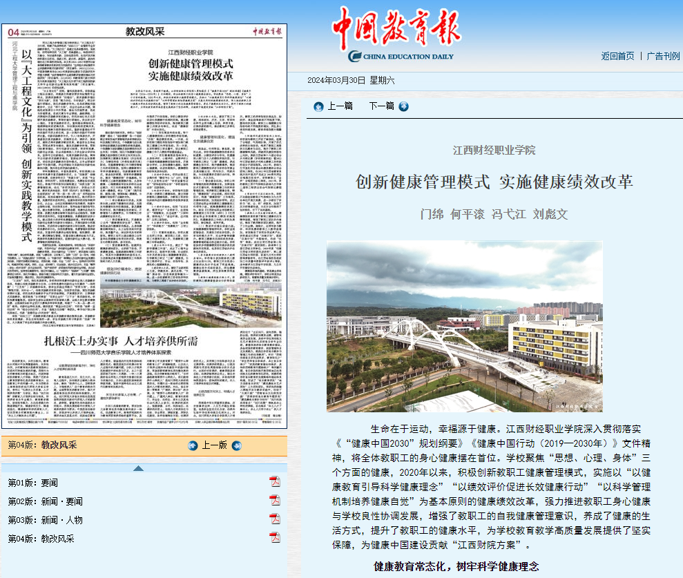 3月30日,中国教育报04版刊登了《beat365平台唯一官网创新健康管理模式 实施健康绩效改革》。