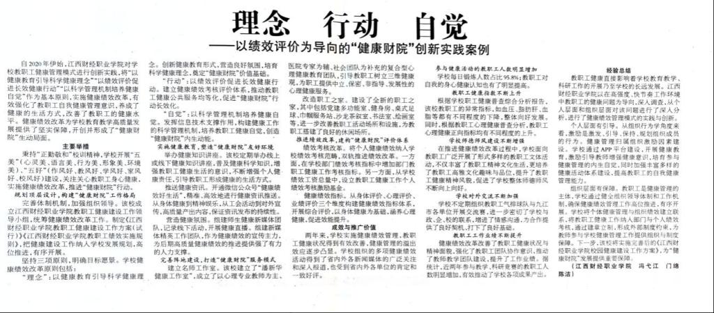 5月11日,江西工人报03版刊登了beat365《理念 行动 自觉——以绩效评价为导向的“健康财院”创新实践案例》。