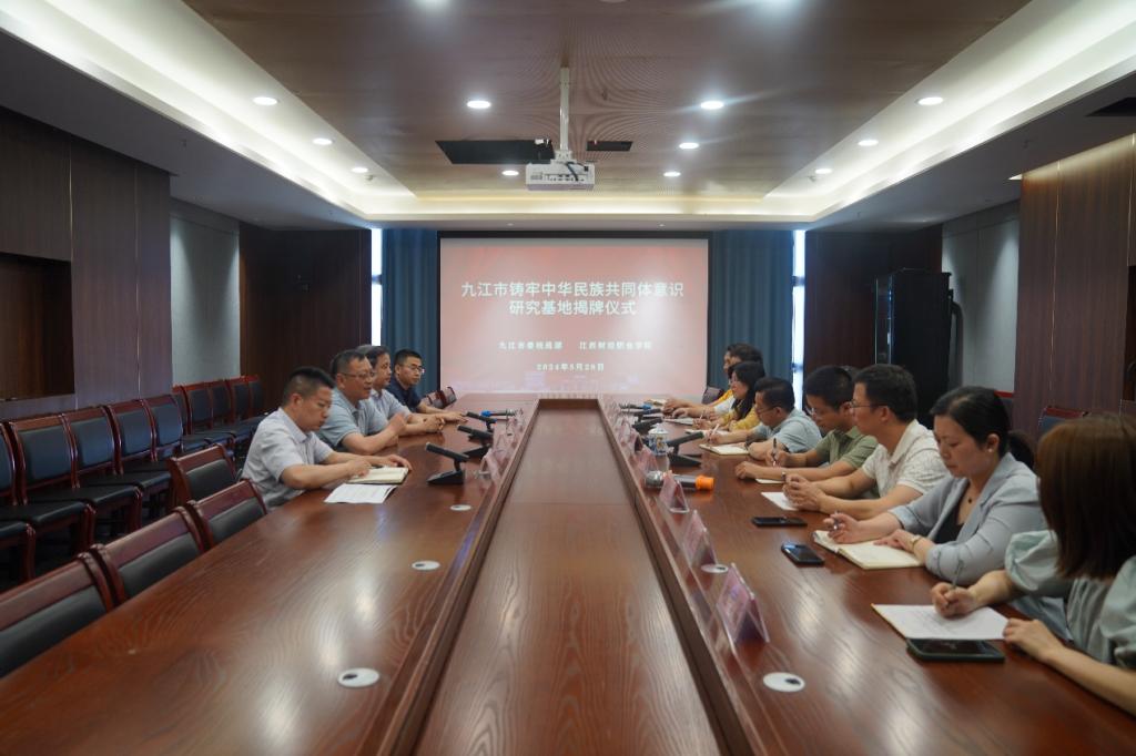 5月28日,九江市铸牢中华民族共同体意识研究基地揭牌仪式在beat365八里湖校区行政楼727会议室举行。市民族宗教事务服务中心主任胡定文、副主任虞功智、民族宗教事务服务中心民族科副科长程清,市委统战部一级主任科员黄晓平,beat365党委委员、副校长邱家明,党委统战部、党委宣传部、学生工作处、团委、教务处、马克思主义学院、安全保卫处等部门负责人参加了揭牌仪式。