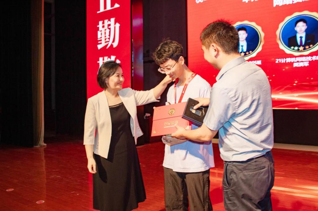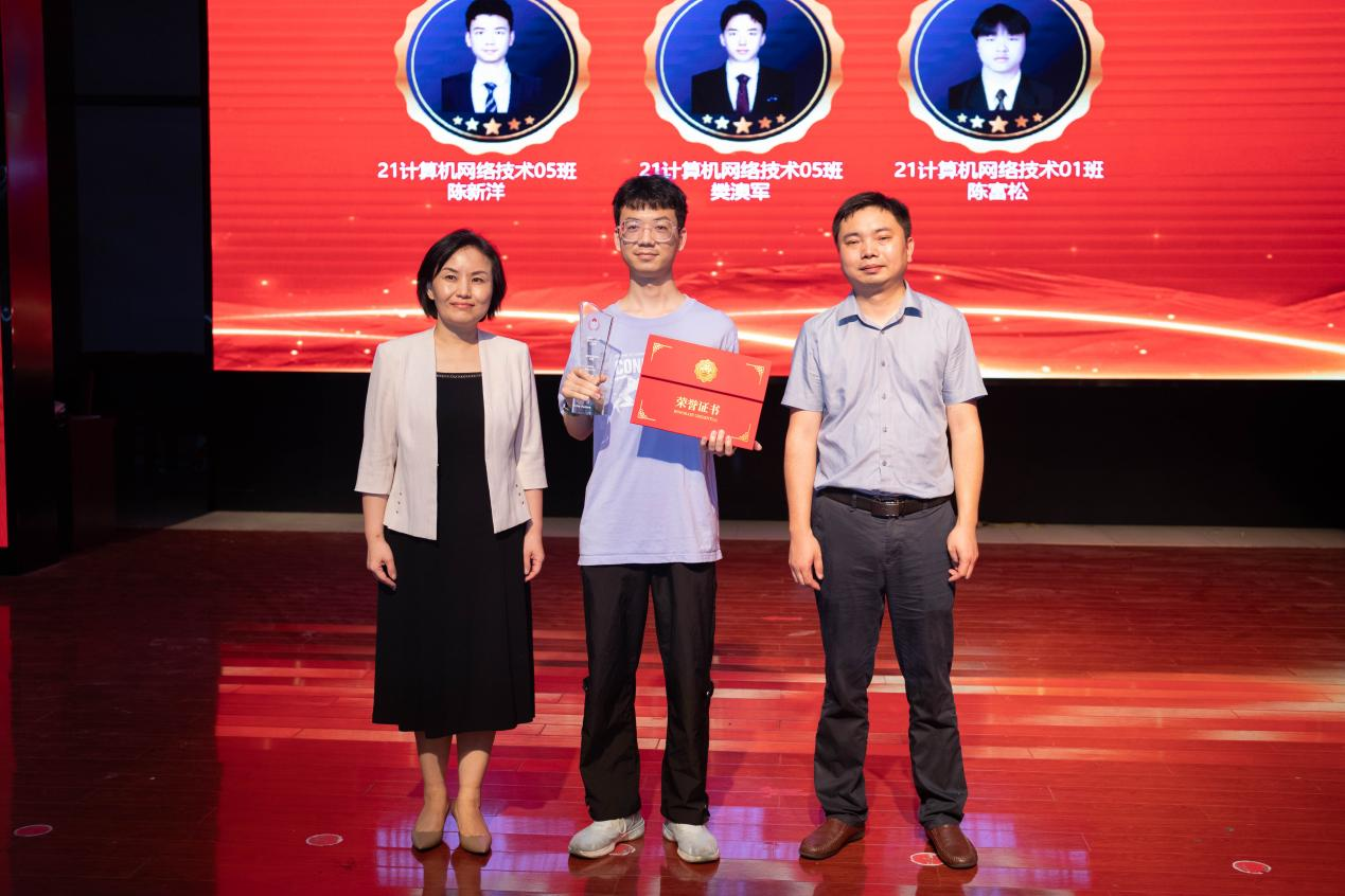 信息工程学院21级计算机网络技术专业由陈新洋、樊澳军、陈富松3位同学组成的参赛队伍斩获该赛事全球总决赛实践赛网络赛道二等奖,站上了国际的舞台,创学校历史最好成绩!陈新洋同学作为获奖代表发言,他表示对学校和鲲鹏产业学院的培养表示感谢,并回顾了学习历程、阐述了学习感受,希望同学们积极努力,用优异的成绩回报学校和社会。会上,他与同学们分享了“白天黑夜的练习,争分夺秒的积累”,所有辛苦的付出都是值得的。他说,从对未来迷茫无知的少年,成为了可以独当一面的ICT专家;从遇到困难畏手畏脚的观望者,成为了敢打敢拼的挑战者;从面对诱惑轻易沦陷的逃避者,成为了可以遵守原则,内心强大的坚守者。他用自己的行动鼓励现场的同学们,要有清晰的目标和坚定的信念,无论何时都要勇于追求自己的梦想,实现自身的价值。他希望22级、23级学弟学妹们继续弘扬华为ICT大赛拼搏精神,展现竞技风采,不断创造新的辉煌!