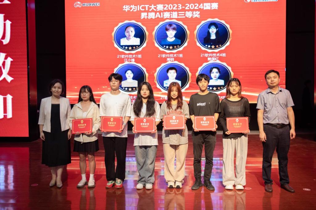 党委副书记、校长彭慧为华为ICT大赛获奖学生代表颁发奖杯和礼品,并合影留念。