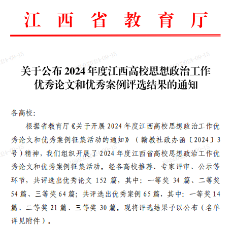 近日,省教育厅公布了2024年度江西高校思想政治工作优秀论文和优秀案例评选结果。beat365选送的3篇论文均榜上有名,荣获思政优秀论文一等奖2项、二等奖1项。