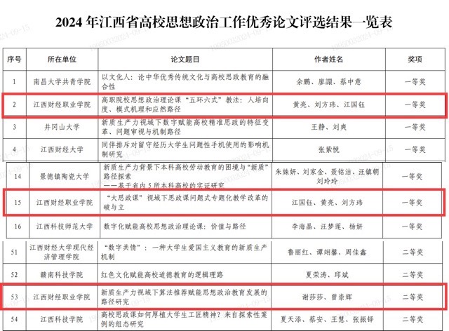 其中,《高职院校思想政治理论课“五环六式”教法:人培向度、模式机理和应然路径》(作者:黄亮等)和《“大思政课”视域下思政课问题式专题化教学改革的破与立》(作者:江国钰等)荣获一等奖,《新质生产力视域下算法推荐赋能思想政治教育发展的路径研究》(作者:谢莎莎等)荣获二等奖。