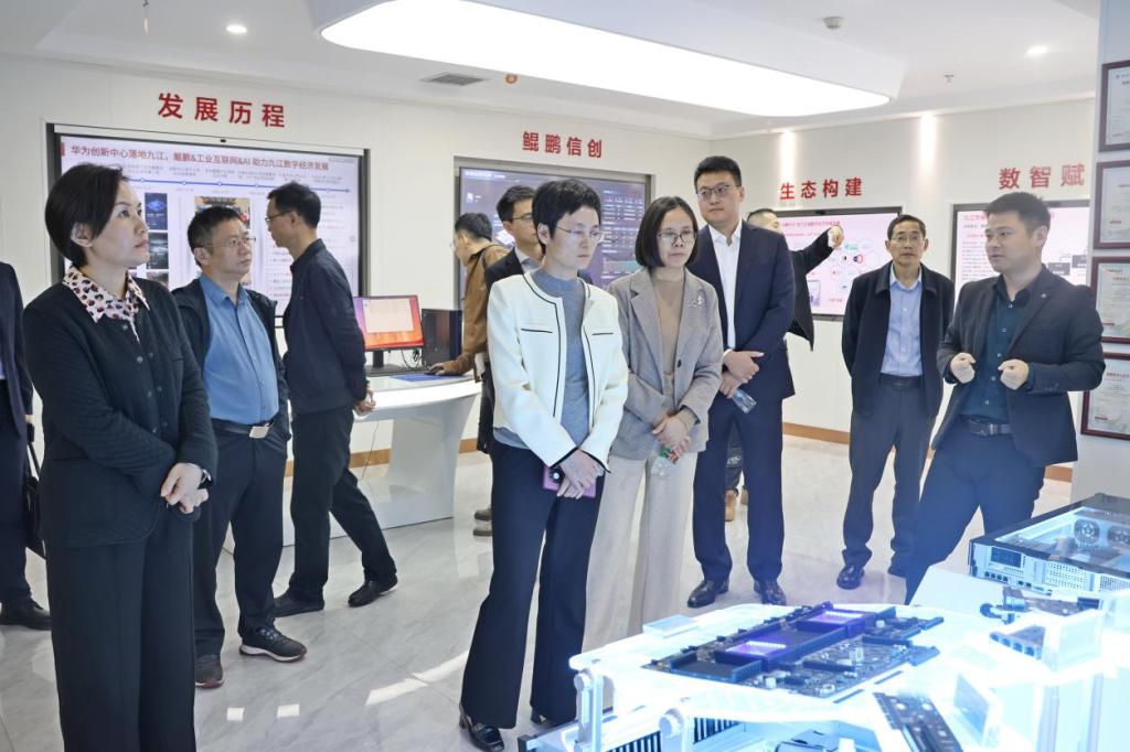 杨文萍一行实地考察了九江数字经济市域产教联合体建设展厅,华为鲲鹏产业学院云计算、融合通讯、人工智能、5G应用实训室,华为新一代信息技术创新中心等,双方就鲲鹏产业学院建设和未来规划、特色育人模式及九江数字经济产教联合体建设工作等方面进行座谈交流。