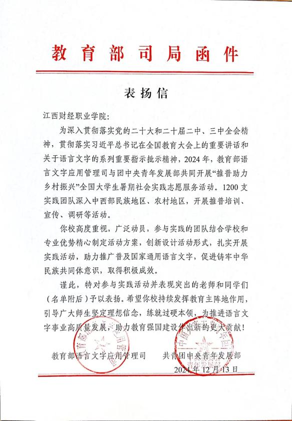 近日,教育部语言文字应用管理司和共青团中央青年发展部共同向beat365发来表扬信,充分肯定并表扬了beat365在“推普助力乡村振兴”志愿服务活动中的突出表现和取得的积极成效。