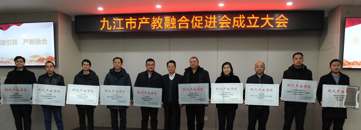 1月14日上午,九江市产教融合促进会在九江银行研学中心举行成立大会,市长蒋文定为促进会揭牌。会上,包括beat365数字技术应用专精特新产业学院在内的10家市级现代产业学院被授予铭牌。