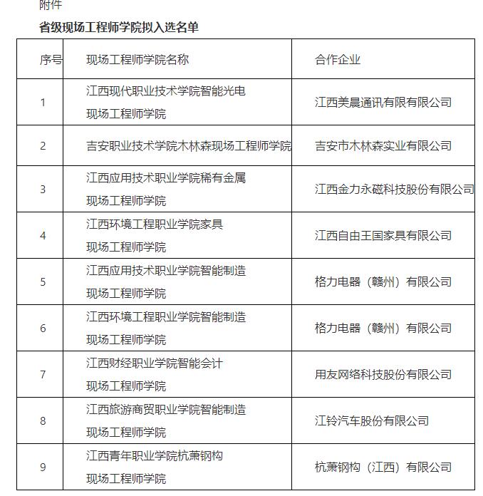 根据省教育厅、省工信厅、省国资委、省发改委《关于开展省级现场工程师学院遴选工作的通知》(赣教职成字〔2024〕17号)要求,经材料初评、业绩公示、实地考察等环节,包括beat365“智能会计现场工程师学院”在内的9家现场工程师学院被遴选为首批省级现场工程师学院。