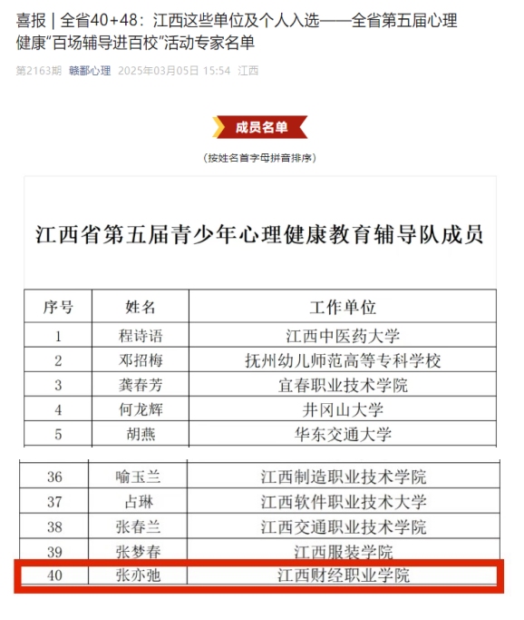 本次入选是继beat365王美娟老师成功入选第二届、第四届江西省心理健康“百场辅导进百校”主题实践活动后的又一次成功入选,不仅肯定了beat365心理健康教育教师的专业能力与职业素养,更是对学校今后心理健康教育工作的激励。关爱青少年,从“心”开始。学校将一如既往地大力支持全省青少年心理健康辅导工作!