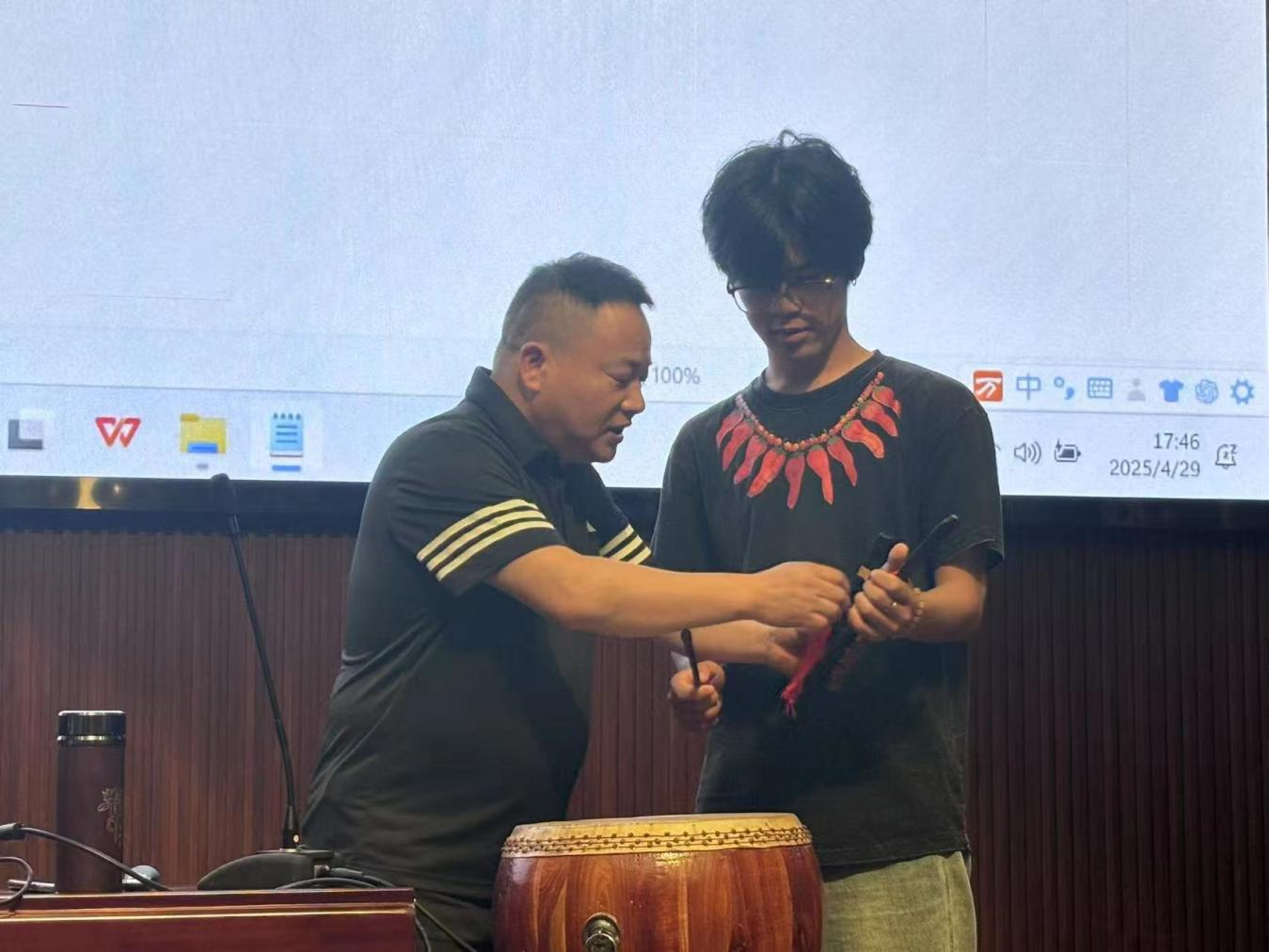 在现场演示环节,张老师展示了精湛的击鼓手法和独特的唱腔技巧,时而铿锵有力,时而婉转悠扬的表演赢得阵阵掌声。互动环节中,同学们在张老师的指导下亲身体验鼓书表演,现场气氛热烈。活动结束后,同学们纷纷表示,这场讲座让他们对非遗文化有了更深的认识,激发了对传统文化的浓厚兴趣。