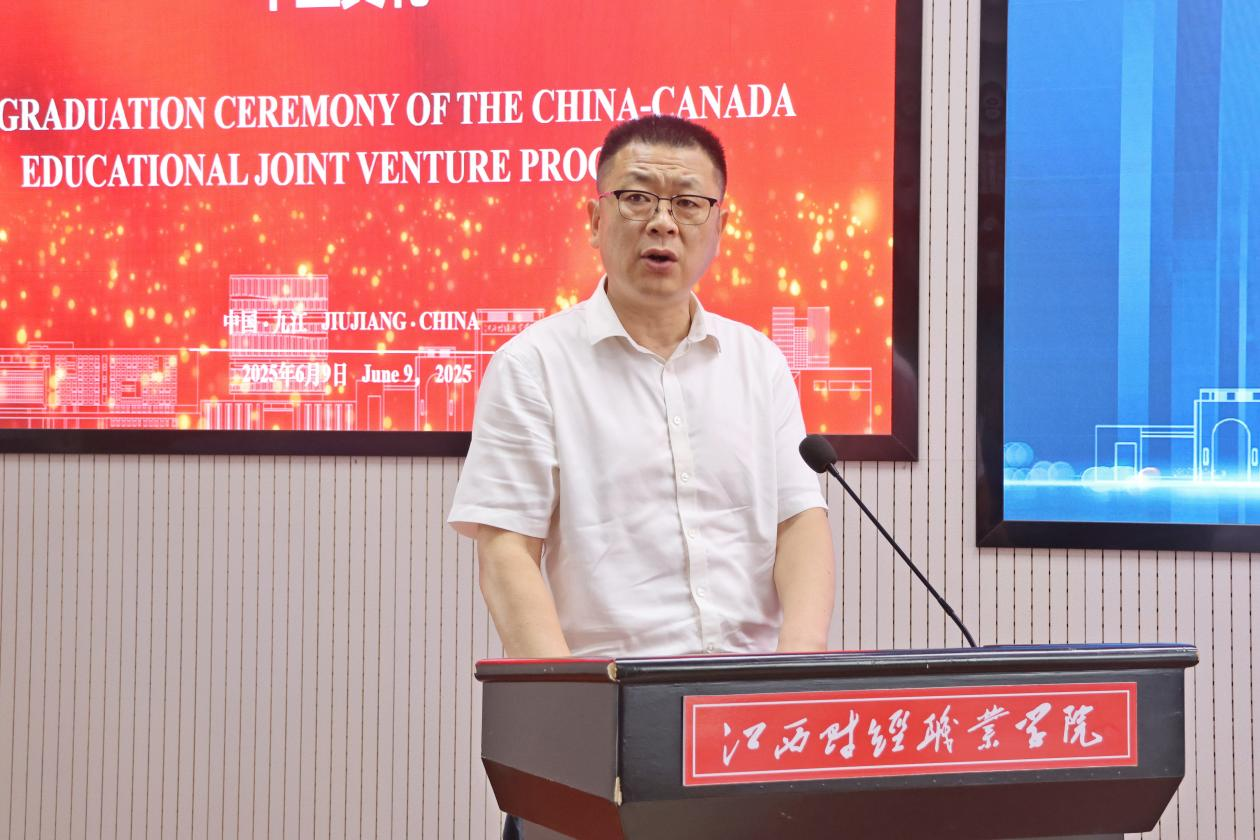 冯弋江在致辞中介绍了学校近年来的国际化办学成果,对远道而来的加拿大荷兰学院教务长Craig Dauphinee一行表示热烈欢迎,对两校老师在项目实施过程中付出的努力表示真挚的感谢,并表达了对毕业生的美好祝愿。他希望同学们以世界为课堂、永葆探索热忱,以文化为纽带、勇担时代使命,以奋斗为底色、书写青春华章,在全球化浪潮中勇立潮头,秉承“正、勤、敬、和”校训精神,努力成长为德才兼备、具有国际竞争力的新时代人才。