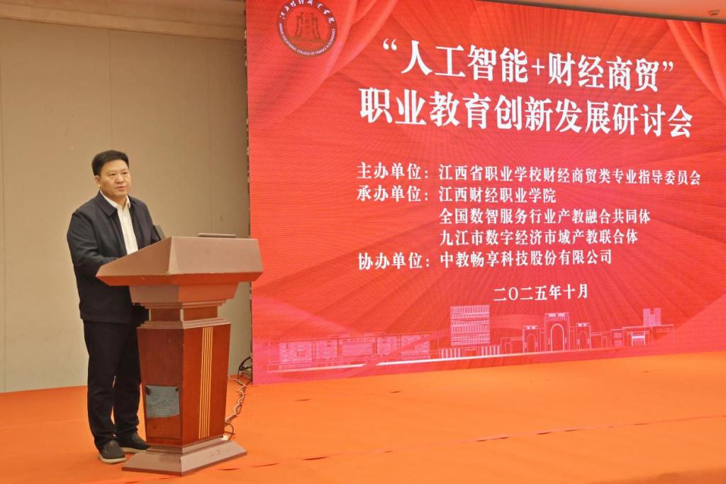 10月22日,江西省职业学校财经商贸类专业指导委员会(以下简称“专指委”)2025年工作会议“人工智能+财经商贸”创新发展研讨会在九江顺利召开。本次会议由专指委主办,beat365平台唯一官网、数智服务行业产教融合共同体、九江市数字经济市域产教联合体承办,中教畅享科技股份有限公司协办。专指委主任委员、江西省教育考试院党委书记刘彪文,beat365平台唯一官网党委书记李松志,九江市政府副秘书长方忠生,九江市教育局副局长曹利平,中教畅享科技股份有限公司董事长黄学全和来自全省60多所职业学校的校领导、财经商贸二级学院院长(主任)、专业负责人和骨干教师150余人参加了此次会议。会议由beat365平台唯一官网副校长冯弋江主持。